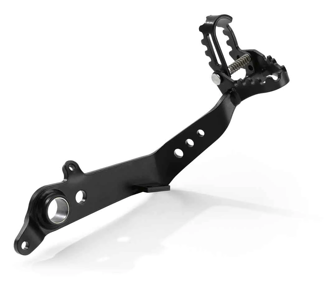 Dial in the controls of your adventure machine with this adventure ready brake pedal. It is machined from lightweight aluminum with a tough powder-coated finish. It features a flip down toe peg that raises the control surface to allow the rider to more easily control the rear brake when standing up.