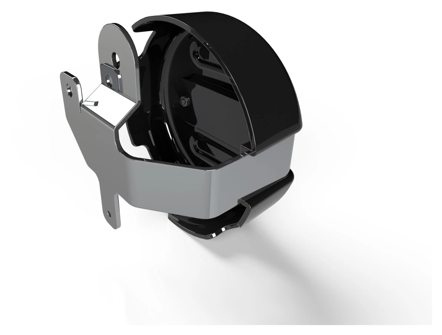This unique horn cover with integrated mounting bracket was specifically designed for installing the Denali Soundbomb Compact Air Horn in the factory horn location on many V-Twin motorcycles. The stylish gloss black ABS shell and chrome plated steel bracket mounts and hides the 120+ decibel SoundBomb Compact Horn on your bike.