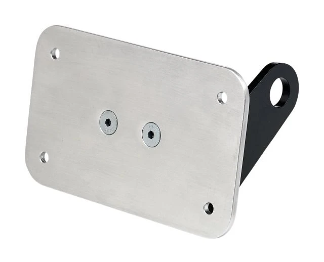 This axle-mount license plate bracket bolts to your 3/4″ axle using your stock hardware for a super clean tucked-in look. Plate can be mounted horizontally or vertically.