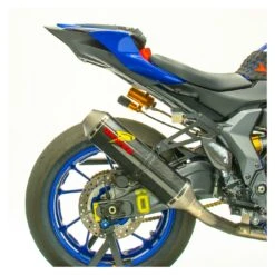 - Diamond shaped carbon fiber muffler design with titanium end cap, configured to balance the R7’s body lines and produce the best balance of power