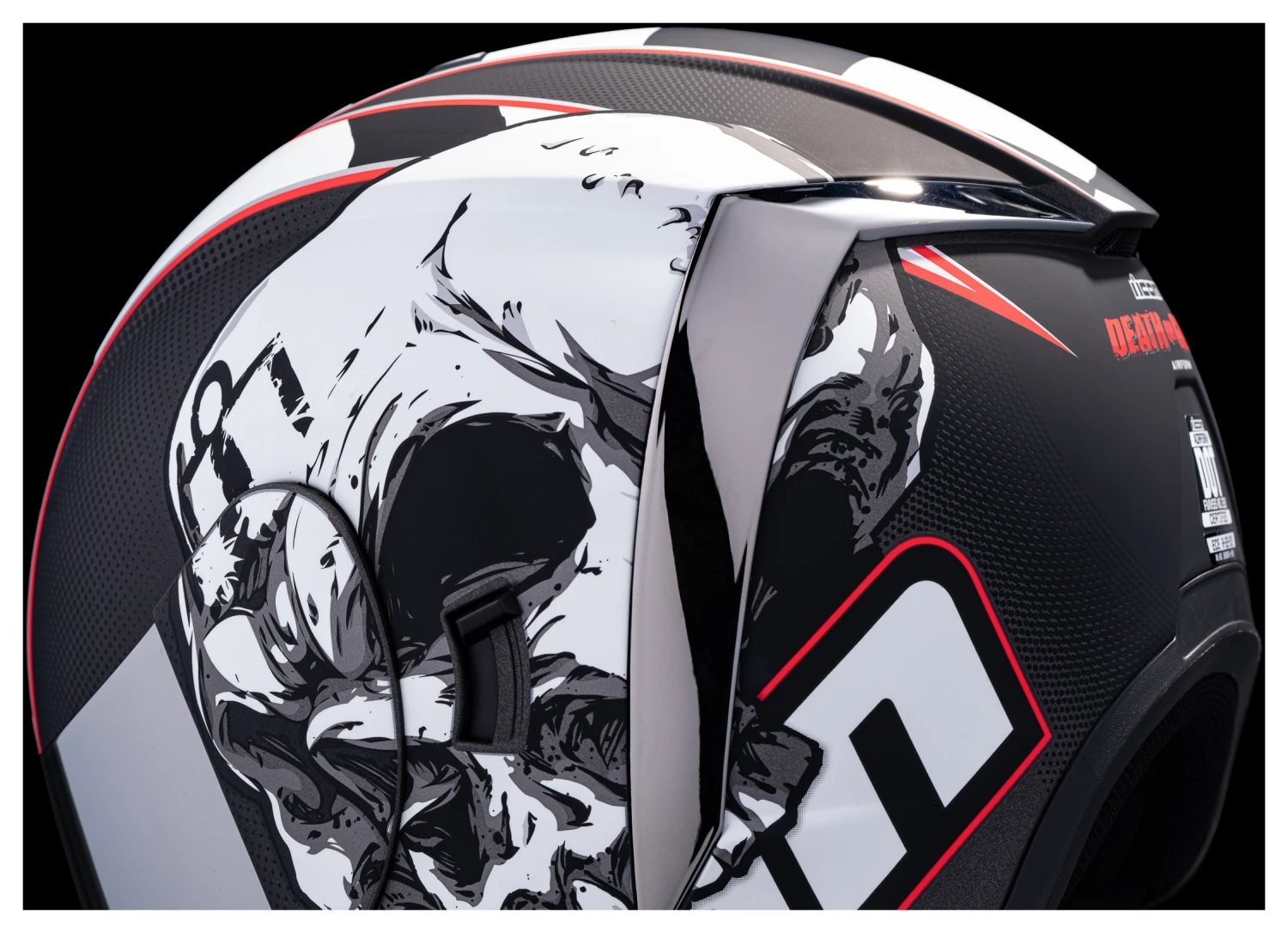 Together with the airflow channels formed in the EPS liner, the Hydradry moisture-wicking interior keeps your head dry. A sculpted neck roll lets you move into and out of the tuck position without as much interference with your jacket, one less thing to distract you while you are riding. Speaker pockets make it easy to install Icon’s R.A.U. Bluetooth Communicator so you can stay connected.