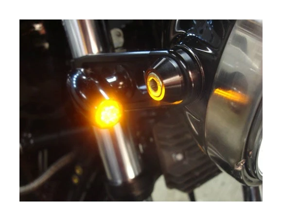 Bullet-style super-bright LED marker lights really clean up the look of your bike. Each features an intensely bright LED module for high light output, amazing for its size which is roughly 3/4″ diameter at the light source. May be rotated into virtually any upward-and-downward setting. All parts are fully CNC-machined from 6061-T6 billet aluminum. Center mount marker lights can be mounted in almost any 5/16″ or 8mm hole. Wires feed through a pre-drilled hole in the hollow mounting bolt. Solid bolt externally wired versions are also available.