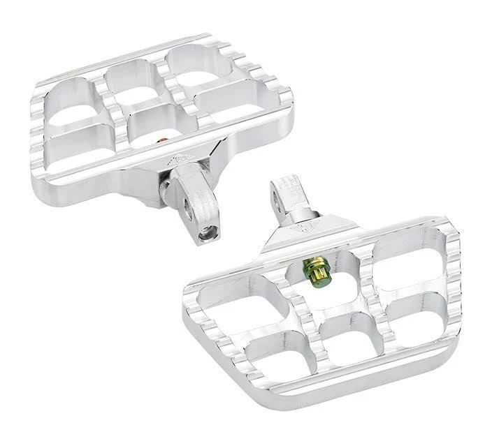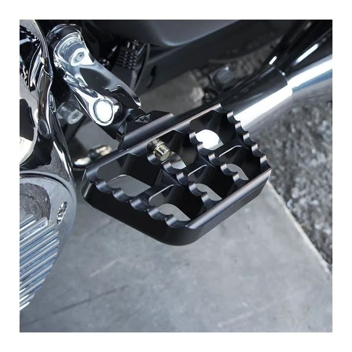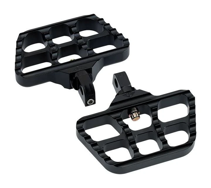 Mini serrated floorboards are made to match the popular Joker Machine serrated foot pegs and floorboards. Can be used as either passenger boards or rider boards. The overall size and functionality is great for any application. Fits most models with standard H-D male-tab foot peg mounts. Designed with 360 degree foot peg adjustment and a pitch adjustment screw for a level riding position. The strong yet light weight 2 piece construction is topped with a serrated surface for exceptional grip and a classic moto style.