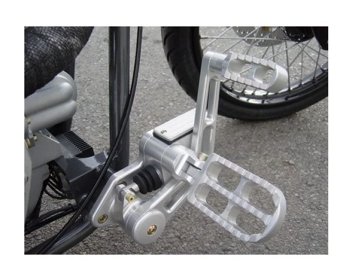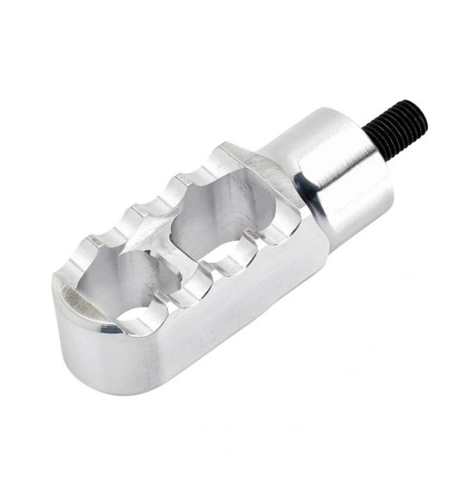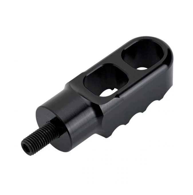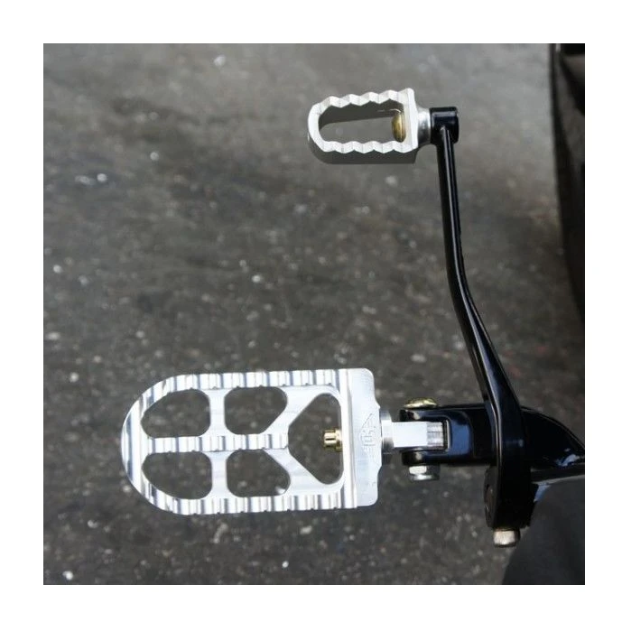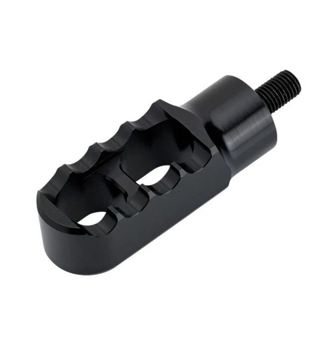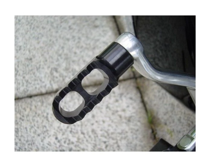 Give your bike a unique design twist with these all-billet aluminum serrated shift pegs. Super strong, yet lightweight one piece construction. The comfortable serrated foot surface area gives you a wider area for your feet and provides a good bite onto the bottom of your shoe. They have serrations on the top surface only, and the bottom side is smooth to provide non-shoe damaging up-shifts. Ergonomically corrects the angle for better feel and operation.