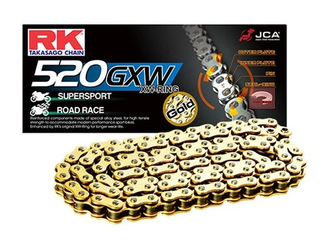 The GB520GXW is RK’s premium quality 520 XW-Ring chain. XW-Ring chains are the best high-speed, extreme heat performance chains available. So, If you’ve modified your ride into an extreme high-speed machine, you need the strength and performance of GB520GXW. With a maximum tensile strength rated at 8,800 foot pounds and suitable up to 1000cc streetbikes and 750cc off-road bikes, GB520GXW can handle anything you dish out!