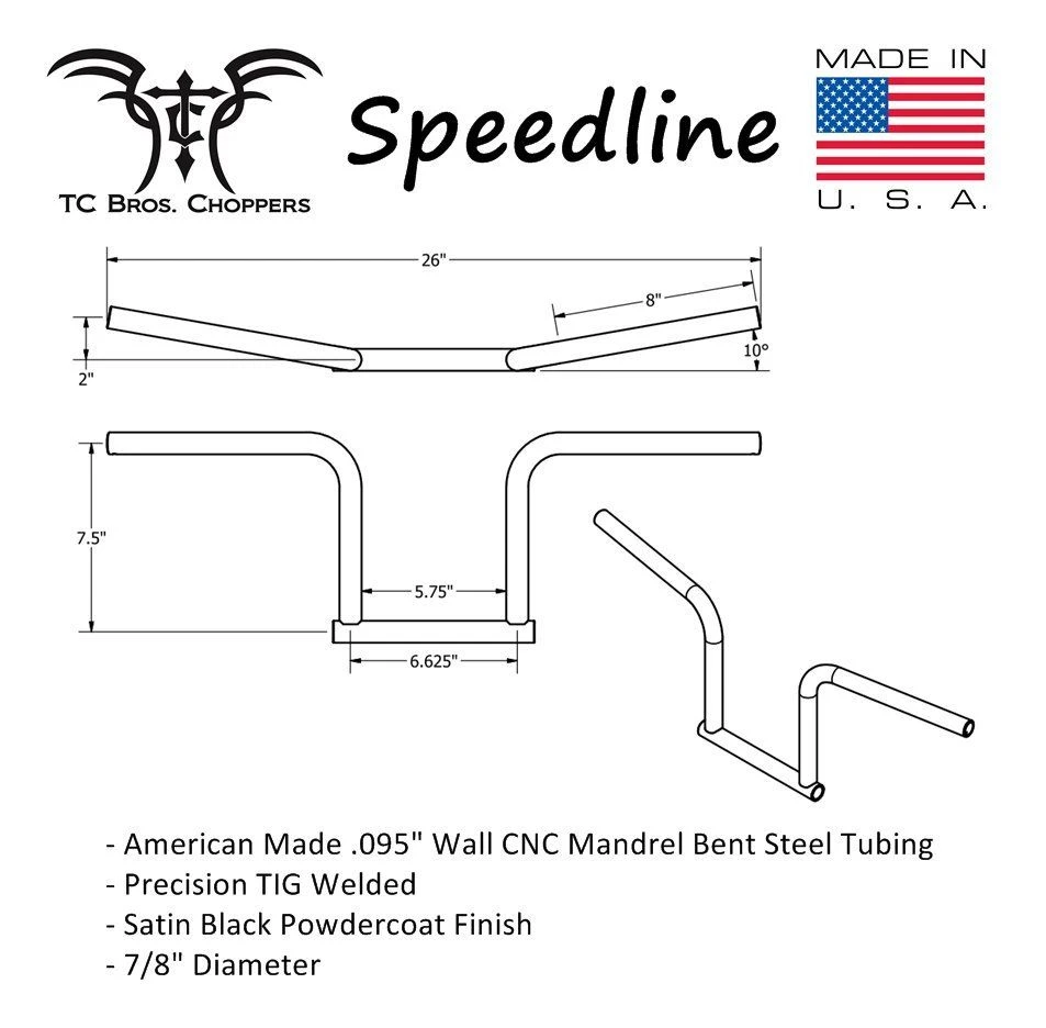 TC Bros Choppers 7/8″ Speed Line Handlebars are made from premium American steel tubing. All joints are precision fit and hand TIG welded to a finish you will be proud to display. The bends are created on a CNC mandrel bender for high quality and flawless symmetry. These bars feature a powder-coat finish for durability and great looks. These narrow bars look great and give a riding position that makes you want to hit up some twisty roads. These bars fit most stock cables, brake lines, and wiring on most motorcycles. Please see photos for dimensions and specifications to confirm fitment.